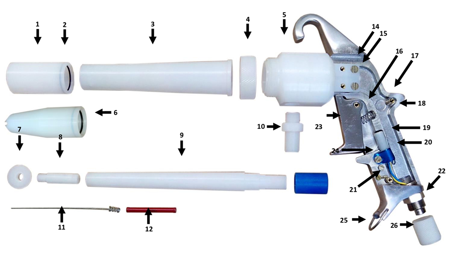 | Componentes pistola ptm1 | 1 SOBRE CAPA JATO CIRCULAR PTM 1, 2 ANEL O’RING DA SOBRE CAPA (JATO PLANO / CIRCULAR), 3 TUBO EXTERNO DA PISTOLA PTM 1, 4 TUBO EXTERNO LONGO DE 280MM, 5 PORCA DA PISTOLA PTM 1, 6 CABEÇOTE DA PISTOLA PTM 1, 7 SOBRE CAPA JATO PLANO PTM 1, 7 DISPERSOR DO PÓ 14,00 MM PTM 1 (COM ROSCA), 7 DISPERSOR DO PÓ 16,00 MM PTM 1 (COM ROSCA), 7 DISPERSOR DO PÓ 20,00 MM PTM 1 (COM ROSCA), 7 DISPERSOR DO PÓ 23,00 MM PTM 1 (COM ROSCA), 7 DISPERSOR DO PÓ 26,00 MM PTM 1 (COM ROSCA), 7 DISPERSOR DO PÓ 32,00 MM PTM 1 (COM ROSCA), 7 DISPERSOR DO PÓ 35,00 MM PTM 1 (COM ROSCA), 8 PROLONGADOR DO DISPERSOR PTM 1, 9 TUBO DO CABO DE ALTA TENSÃO, 9 TUBO DO CABO DE ALTA TENSÃO LONGO 330MM, 10 NIPLE DA MANGUEIRA (NIPLE DE ENTRADA DO PÓ), 11 ELETRODO PTM 1, 12 RESISTÊNCIA DE 150 MEGA OHMS, 13 BUCHA DO TUBO DE ALTA TENSÃO, 14 PARAFUSO CHATO M4, 15 ABRAÇADEIRA DO CABO DE ALTA TENSÃO (PRENDE O CABO DE ALTA NO CABEÇOTE), 16 MOLA DO GATILHO, 17 BUCHA ESPAÇADORA DE LATÃO M4, 18 EMPUNHADURA DE ALUMÍNIO, 19 CHAVE RED SWITCH, 20 ABRAÇADEIRA DA CHAVE RED SWITCH, 21 TERMINAL ARGOLA, 22 PRENSA CABO DE ALTA TENSÃO (METÁLICO), 23 GATILHO PTM 1, 24 PARAFUSO M3, 25 PRESILHA DA MANGUEIRA DE TINTA, 26 PORCA DO PRENSA CABO DE ALTA TENSÃO (PLÁSTICO) |